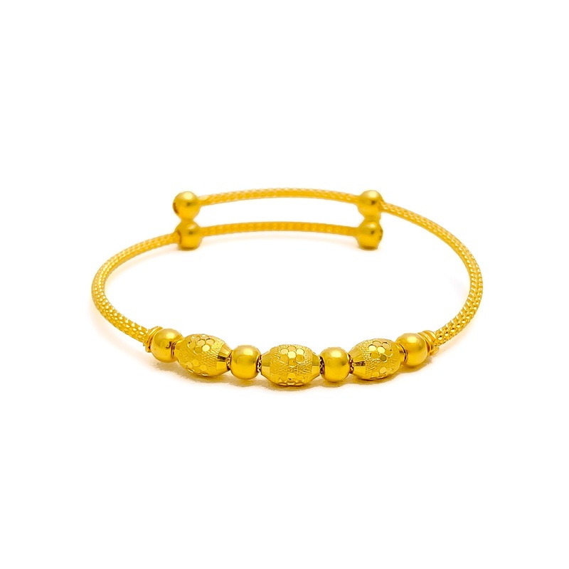 This 22k gold baby bangle features an elongated shimmering oval design, perfect for adding elegance to little wrists. Weighing 5.5 grams, it boasts a yellow gold finish that enhances its exquisite appearance. With a diameter of 1.75 inches, this adjustable