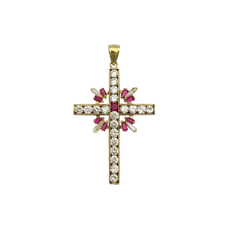 Precious Metal: 14 KaratYellow GoldGemstones:Cubic ZirconiaRound Shaped: White and RedTapered Baguette:White and RedStones may be upgraded upon requestHeight: 56.1 mm*Width: 32.67 mm*Thickness: 3.68 mm*Approx. Weight: ~8.5 grams**All weights and measuremen