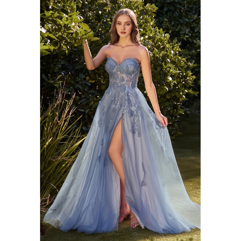 Embroidered applique long strapless corset dress