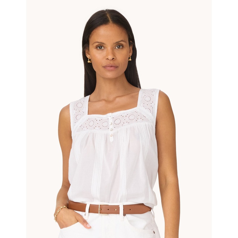 timeless elegance with an easy fit. this cotton voile tank is finished with pintuck and shirred detailing. the quarter placket features italian akoya-shell buttons.square neckline with embroidered trimpintuck and shirred detailing from necklinea-line bodyo