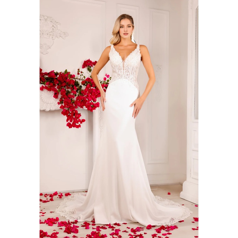 Embroidered lace long sleeveless satin wedding dress