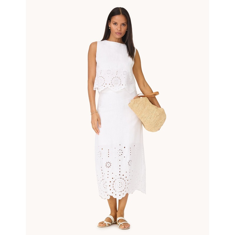 an effortless take on a staple. crafted from crisp, breathable linen, this pencil skirt features timeless embroidery and scalloped trim. make it a set with the matching tank.