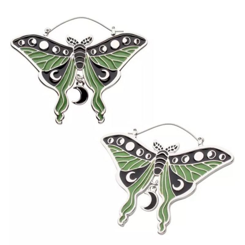 These 20 gauge enamel lunar moth hoop earrings have a bright silver. They measure about 65mm wide by 45mm high. The hinged post is made from 316L surgical steel. They can be worn as regular earrings, but the oversize design is intended to fit comfortably inside most flesh tunnels. Sold as a pair.