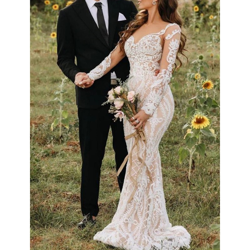 Engagement Formal Boho Wedding Dresses Mermaid / Trumpet Illusion Neck Long Sleeve Sweep / Brush Train Lace Bridal Gowns With Appliques