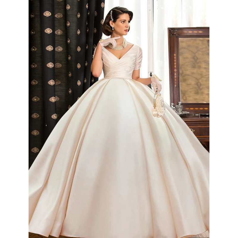Engagement Formal Fall Wedding Dresses Ball Gown V Neck Short Sleeve Court Train Satin Bridal Gowns With Ruched Solid Color Summer Wedding Party, Womens Clothing