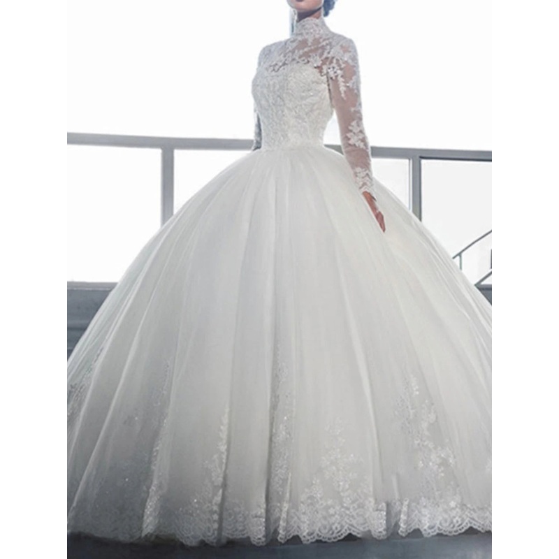 Engagement Formal Wedding Dresses Ball Gown High Neck Long Sleeve Sweep / Brush Train Lace Bridal Gowns With Beading Appliques