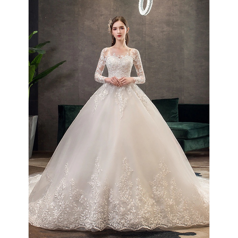 Engagement Formal Wedding Dresses Ball Gown Illusion Neck Long Sleeve Cathedral Train Lace Bridal Gowns With Pleats Appliques