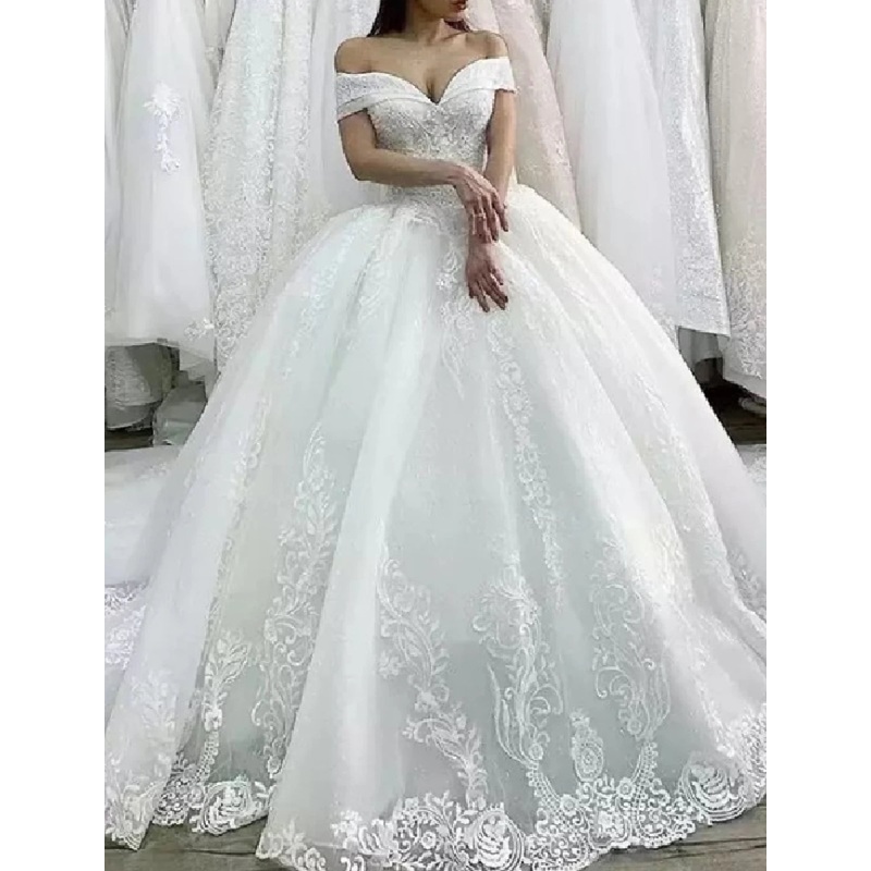 Engagement Formal Wedding Dresses Ball Gown Off Shoulder Cap Sleeve Chapel Train Lace Bridal Gowns With Appliques