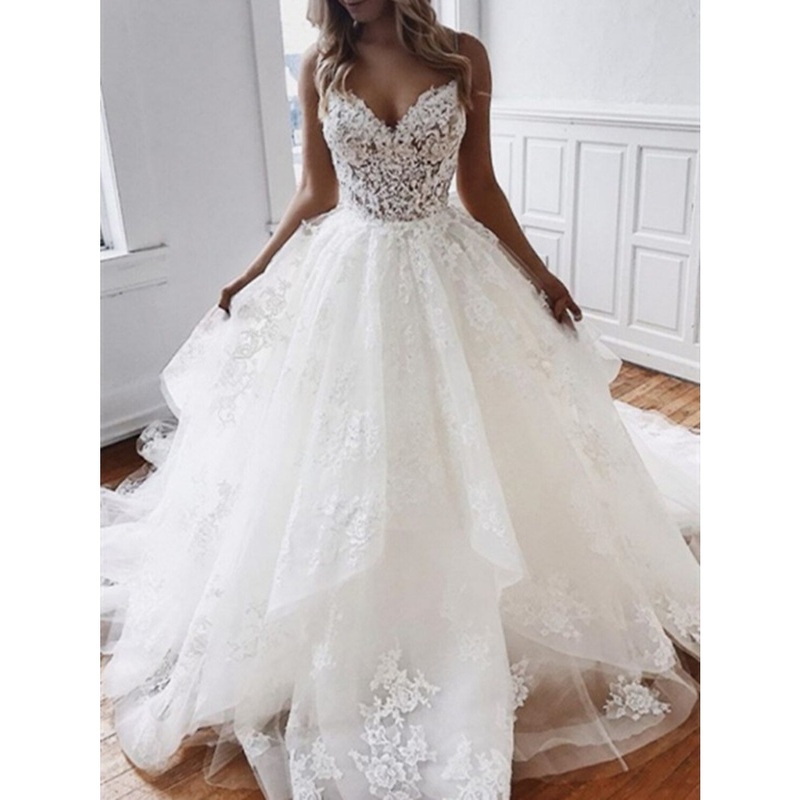 Engagement Formal Wedding Dresses Ball Gown Sweetheart Camisole Spaghetti Strap Chapel Train Lace Bridal Gowns With Appliques