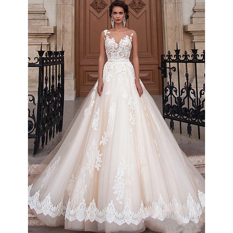 Engagement Open Back Formal Wedding Dresses Ball Gown Illusion Neck Sleeveless Court Train Satin Bridal Gowns With Appliques Summer Wedding Party, Women's Clothing