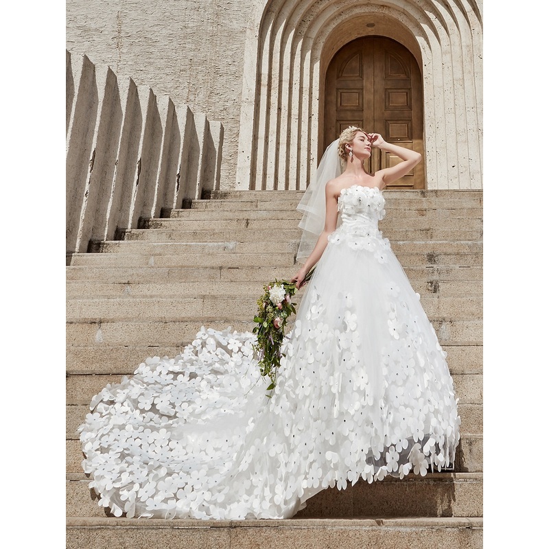 Engagement Open Back Formal Wedding Dresses Ball Gown Square Neck Strapless Chapel Train Lace Bridal Gowns With Crystals Flower