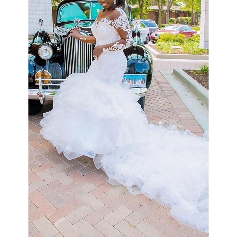 Engagement Plus Size Curve Formal Wedding Dresses Mermaid / Trumpet Off Shoulder Long Sleeve Cathedral Train Lace Bridal Gowns With Appliques Solid Color