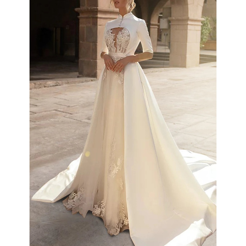 Be the first to review “Engagement Royal Style Formal Wedding Dresses A-Line Sweetheart Half Sleeve Court Train Satin Bridal Gowns With Ruffles Appliques” Cancel reply