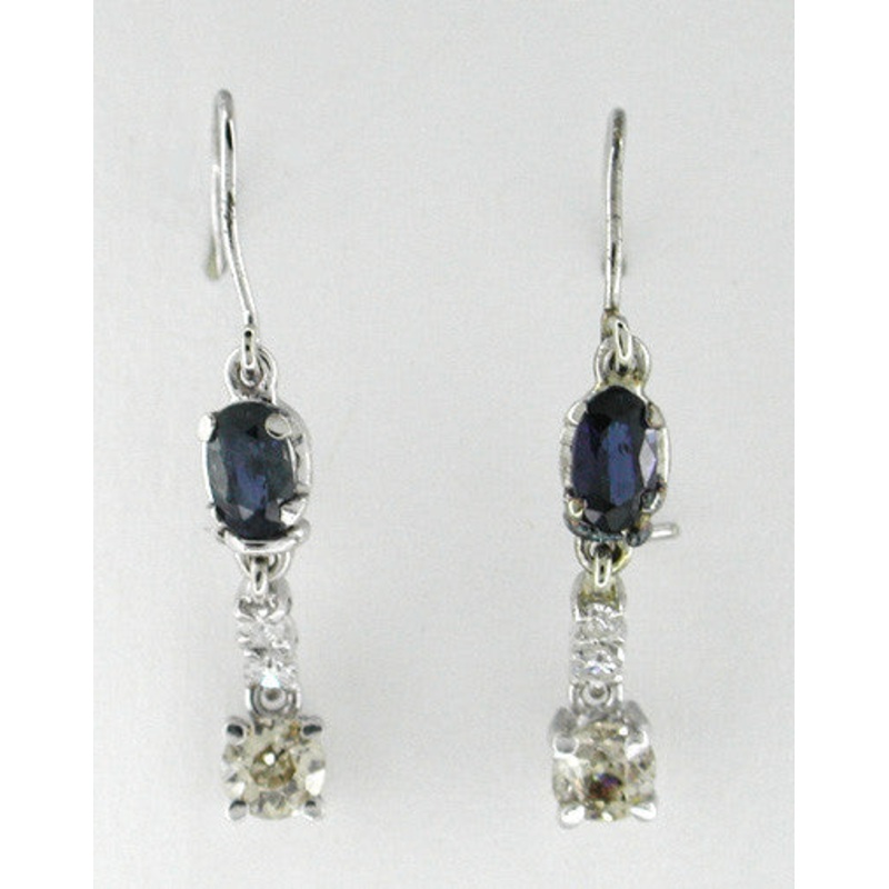 Finely crafted in 14K white gold, these drop estate sapphire earrings, circa 1930’s, are drop dead gorgeous, and will catch the light with every movement of your head. Lovely oval blue sapphires ( September birthstone ) and round diamonds flow downward into scintillating old mine cut champagne colored diamonds for a total diamond weight of 0.60 carat for the pair. Hook back kidney ear wires help to secure these wonderful earrings. These vintage blue sapphire earrings are perfect for special occasions and will make you feel special every time you put them on!