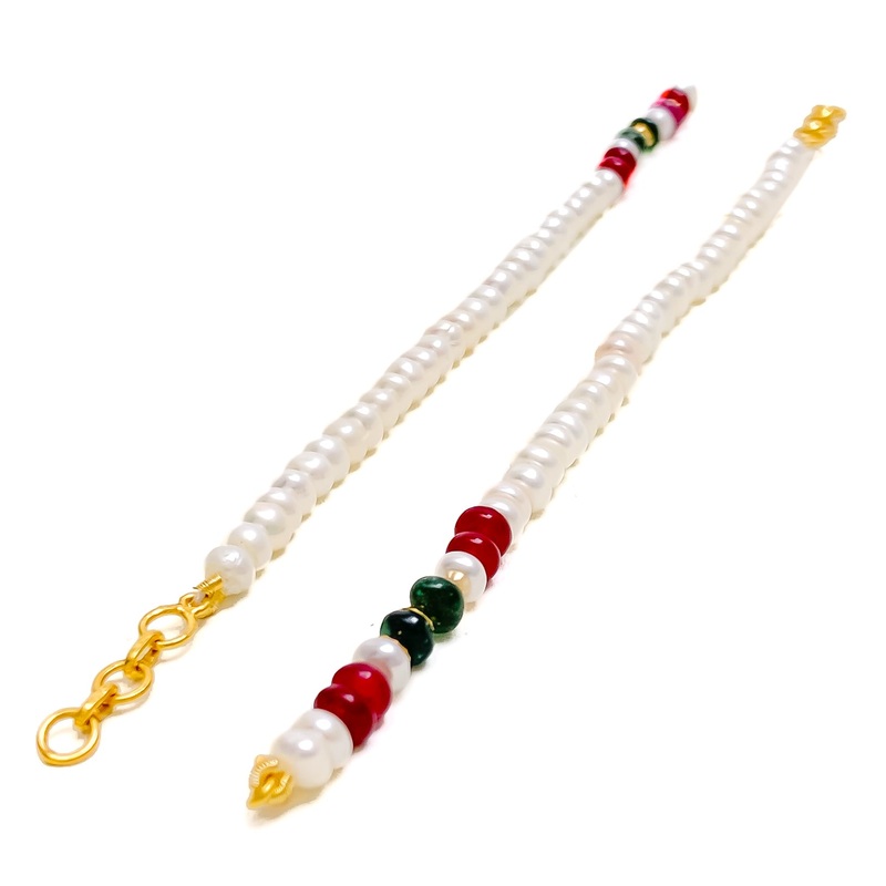 Graceful and luxurious, this 22k yellow gold earrings support chain is adorned with lustrous pearls, rich rubies, and vibrant emeralds, creating a timeless and elegant appeal. Weighing 5.5 grams, its polished gold finish enhances the intricate craftsmanship, exuding sophistication and charm. Measuring 4.5 inches in length, the support chain features 0.5-inch adjustable links, ensuring a comfortable and secure fit. Designed for those who appreciate classic beauty with a touch of regal brilliance, this exquisite two-piece set is a stunning addition to any fine jewelry collection.