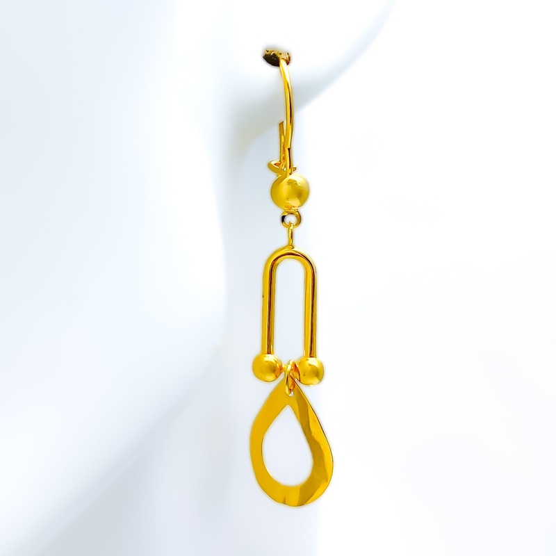 Graceful and captivating, these 21k yellow gold hanging earrings embody artistic elegance with their intricate craftsmanship and fluid design. Weighing 3.5 grams, their polished gold finish enhances the delicate detailing, exuding a luminous and refined charm. Measuring 2.25 inches in length, these earrings create an elongated, elegant silhouette, perfect for both everyday wear and special occasions. Secured with a comfortable hook-back post, they ensure effortless wear and a secure fit. Designed for those who appreciate unique artistry with a timeless touch, these exquisite earrings are a stunning addition to any fine jewelry collection.