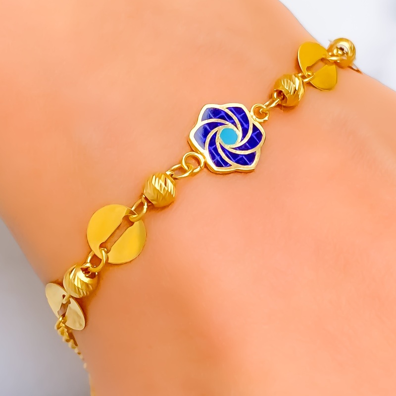 Gracefully designed with a radiant faceted finish, this 21k yellow gold bracelet exudes timeless elegance and sophistication. Weighing 4.7 grams, its polished gold surface enhances the intricate detailing, creating a luminous and refined appeal. Measuring