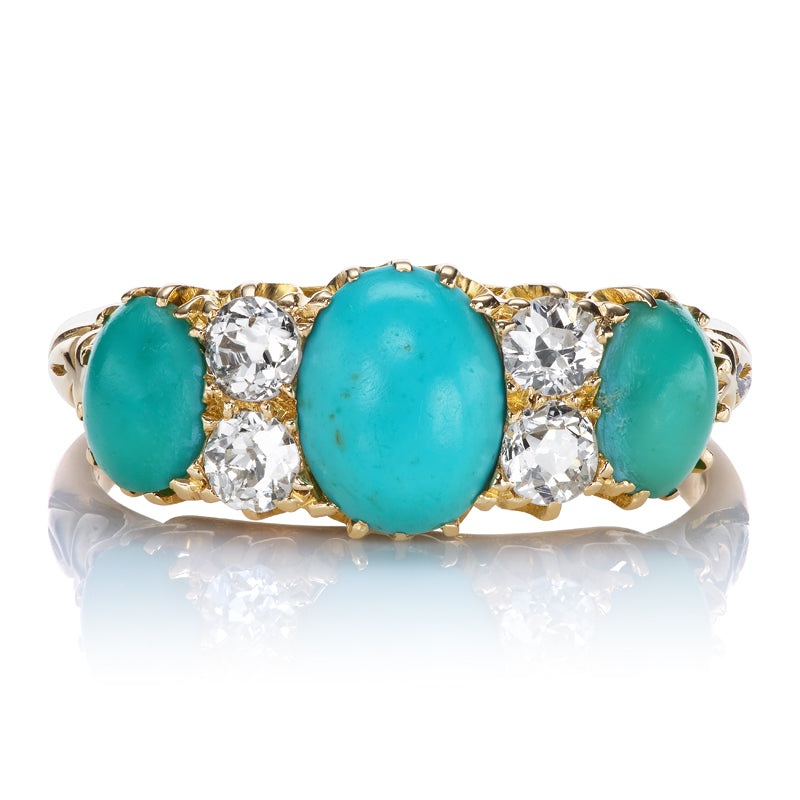 The Eudora ring is an authentic antique turquoise and diamond ring from the Victorian Era circa 1850. The ring features three Cabochon Turquoise Stones. Four old European cut diamonds of H-I color, SI clarity are set in between the three turquoise stones. The diamonds combine for an approximate total of 0.60 carats. The stone is set in an 18kt Yellow Gold setting. The ring is currently size 8.5 and can be resized!