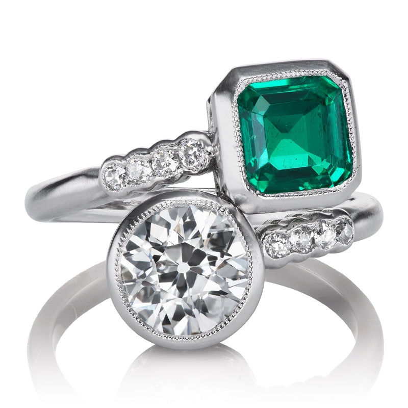 This ring was originally an antique piece but the ring itself wasn’t sturdy enough for daily wear. So, we took the stones out and remade the ring with the same stones and same design to make sure that she would last another 100+ years! As hopeless romantics, we can’t help falling for this dreamy toi-et-moi ring. With its two stones representing “you and me,” this ring is the perfect way to show your other half your love and devotion. A sparkling, bright Old European Cut diamond is complemented by a rich green Colombian emerald, resulting in a a perfectly balanced piece of art. A match made in heaven!