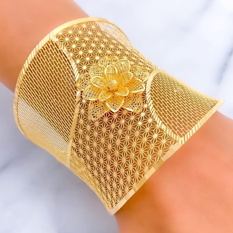 This exclusive cuff, crafted in 21k yellow gold and weighing 19.1 grams, boasts a refined floral mesh design. It features a 2.25" diameter and a 2.5" length, tailored for a comfortable and elegant fit. The round opening and an openable design with a lobste