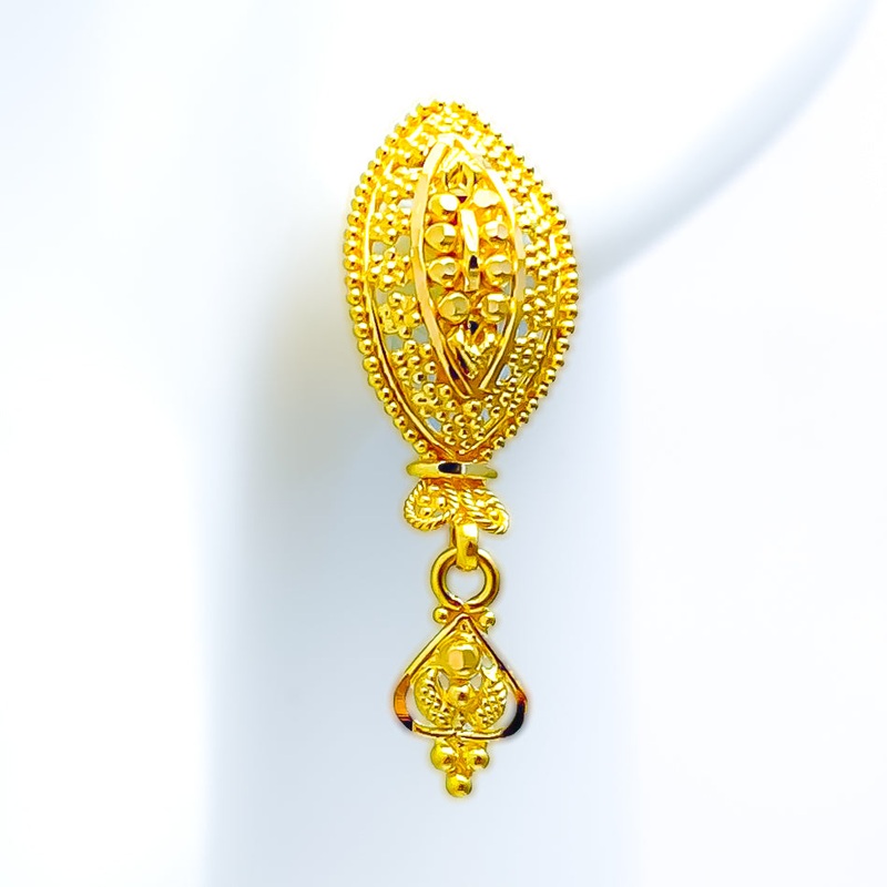 These exquisite 22k yellow gold earrings, weighing 4.6 grams, feature an intricate beaded leaf design that exudes elegance and sophistication. Designed in a classic tops style, each earring measures 1.2 inches in length and is secured with a screw-back post, ensuring a comfortable and secure fit. The high-purity gold and detailed craftsmanship make these earrings a standout addition to any jewelry collection. Ideal for those who appreciate unique and refined designs, they are perfect for both special occasions and adding a touch of luxury to everyday wear.