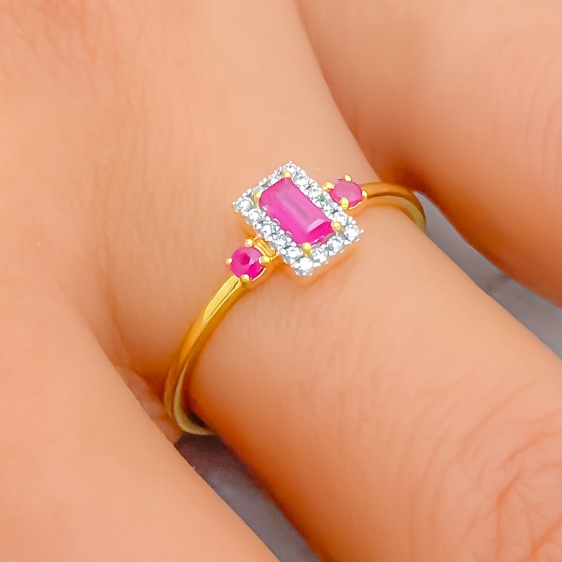 This 18k gold ring features an exclusive lush design, perfect for adding elegance to any outfit. Weighing 1.4 grams, it showcases a yellow gold finish that highlights its sophisticated look. The ring is adorned with a 0.06ct round brilliant cut diamond of G-H color and VS quality, along with a 0.25ct cultured ruby in round and baguette shapes. Sized at 7.25, with resizing available, this ring combines the brilliance of diamonds with the vibrant allure of rubies. Certified by GGL, it brings a touch of luxury and geometric charm to your jewelry collection.