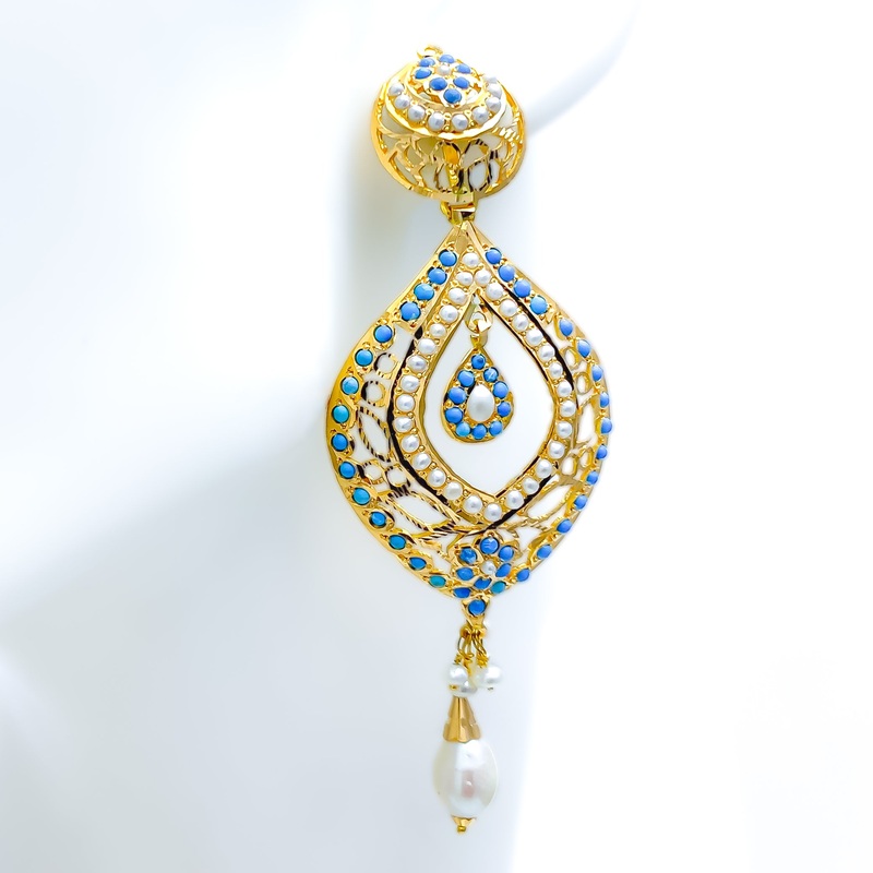 These Exclusive earrings, crafted from 22K yellow gold and weighing 21.5 grams, feature a luxurious blend of pearls and turquoise. The hanging design, with a length of 3.5 inches, offers a graceful and elongated silhouette. Secured with screw-back posts, t