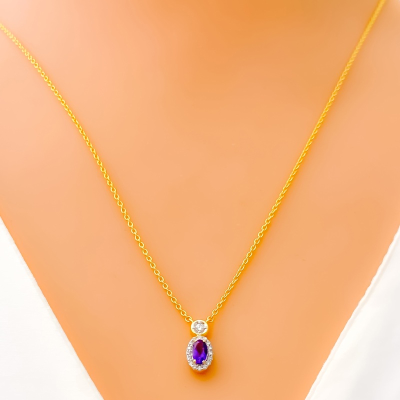 This exquisite 18k gold necklace, weighing 2.8 grams, showcases a captivating oval-shaped cultured amethyst paired with a dazzling round brilliant-cut diamond totaling 0.08ct. The luminous G-H color and VS clarity diamond enhance its refined elegance, while the deep purple amethyst adds a rich, sophisticated touch. Measuring 18 inches in length with a graceful 0.5-inch drop, this piece offers versatility with 2-inch adjustable links. Secured with a durable lobster ring lock, this necklace seamlessly blends timeless charm with modern luxury, making it an essential addition to any fine jewelry collection.