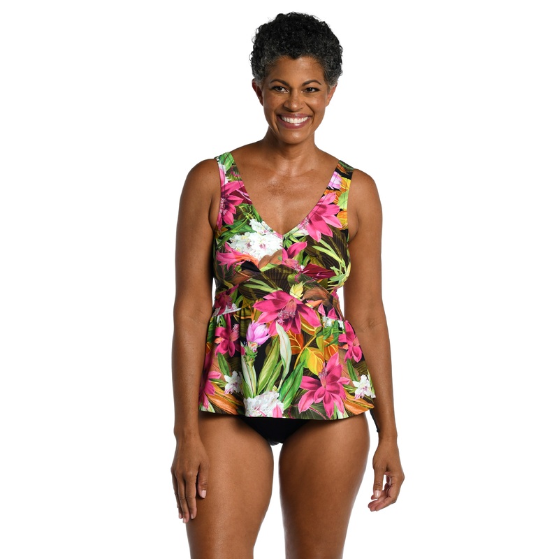 Show off your wild side in this swim top inspired by the flora and fauna of the Amazon Rainforest. This tankini has a flattering empire cut that cinches above your natural waist, instantly slimming the tummy with a flowy fit. Removable cups with underwires and thick fixed straps offer comfortable support. Top sold separately.