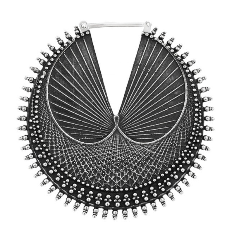 These expo 67 earrings are cast from solid copper, yellow brass, white brass, or .925 sterling silverby MayaJewelry. Theyfit stretched ear lobes sized 12 gauge or larger.Dimensions: 70mm high X 67mm wideWeight: approximately 48grams each piece