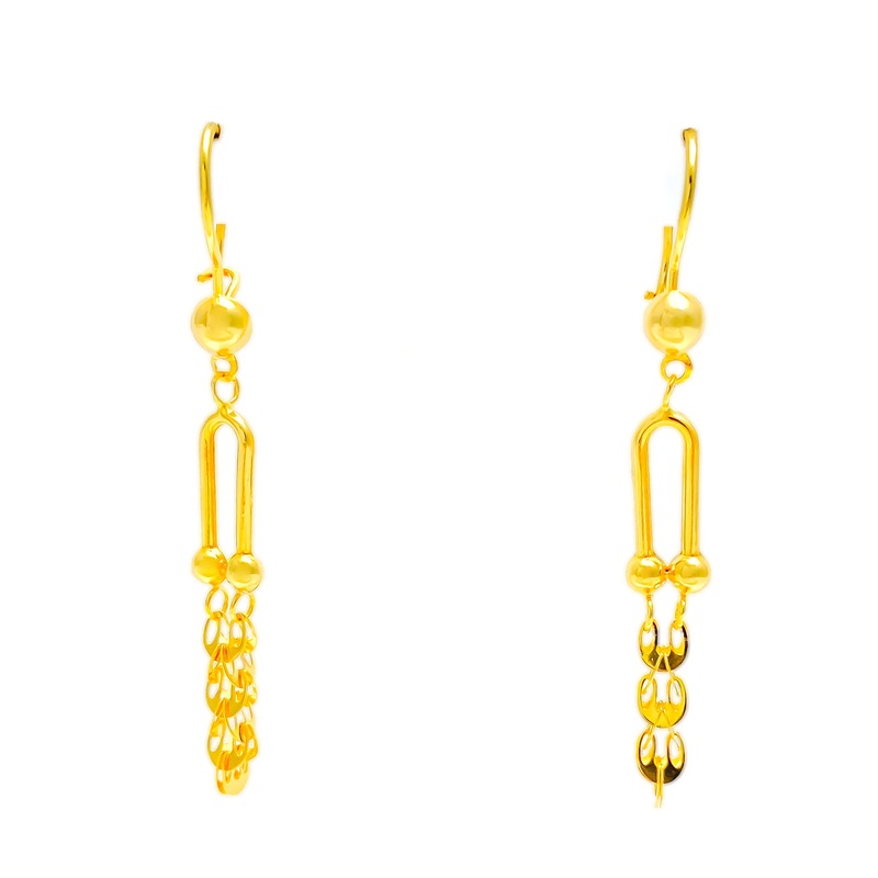 Elegant and delicately crafted, these 21k yellow gold hanging earrings showcase a refined design with timeless sophistication. Weighing 3.1 grams, their polished gold finish enhances the intricate detailing, creating a luminous and graceful appeal. Measuring 2.2 inches in length, these earrings offer a sleek, elongated silhouette, making them perfect for both everyday elegance and special occasions. Secured with a comfortable hook-back post, they ensure ease of wear and a secure fit. Designed for those who appreciate fine craftsmanship with a dainty yet striking presence, these exquisite earrings are a stunning addition to any fine jewelry collection.