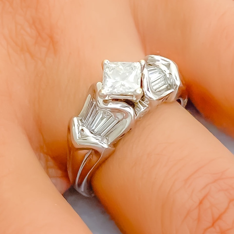 This stunning 18k white gold ring, weighing 6.2 grams, showcases a captivating combination of 1.06 carats of princess-cut and baguette diamonds in F-G color and VS quality. The central princess-cut diamond, enhanced by baguette accents, creates a refined, geometric sparkle that is both timeless and modern. Sized at 6.75 with resizing options available, this ring is perfect for those who appreciate classic elegance with a contemporary touch, making it a luxurious addition to any jewelry collection.