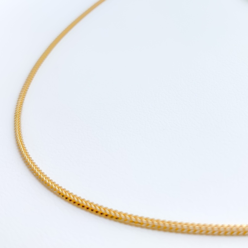 This sleek 22K gold fox chain is notably slender with a width of just 1 mm, blending sophistication with subtle elegance. Weighing 4.8 grams, this extra thin chain features a beautiful two-tone finish in yellow gold, extending 20 inches in length. It is se