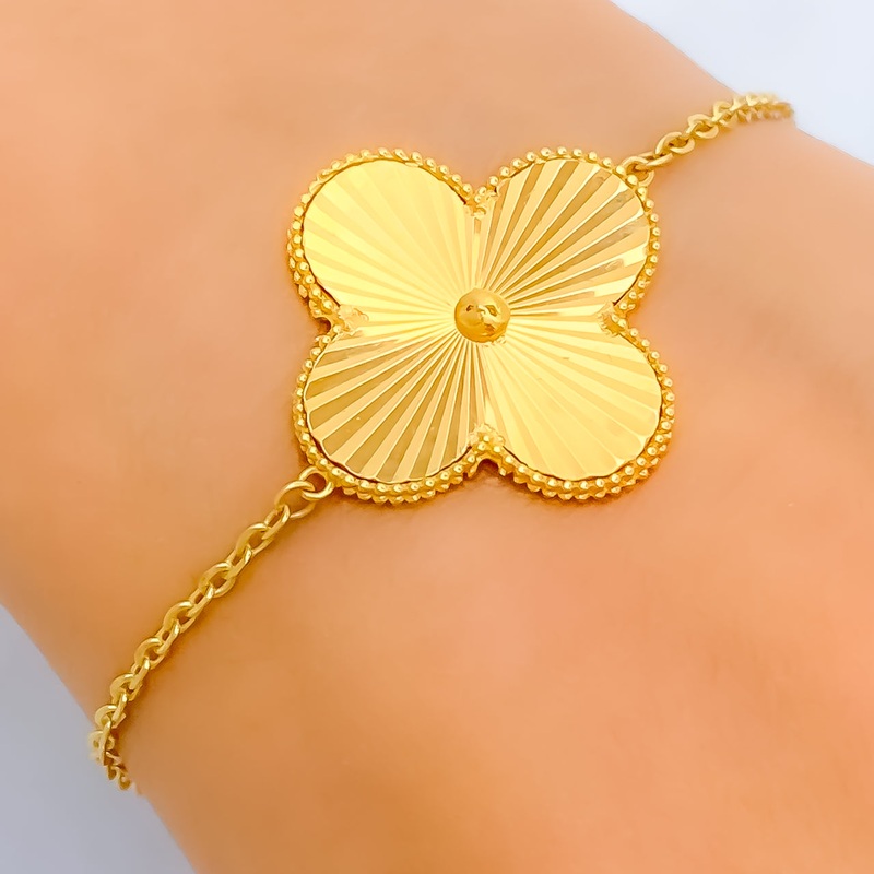 This 21k yellow gold bracelet, weighing 5.6 grams, displays an extravagant glistening flower design that captures the essence of elegance and charm. The bracelet measures 7 inches in length, complemented by an additional 0.5 inches of adjustable links for