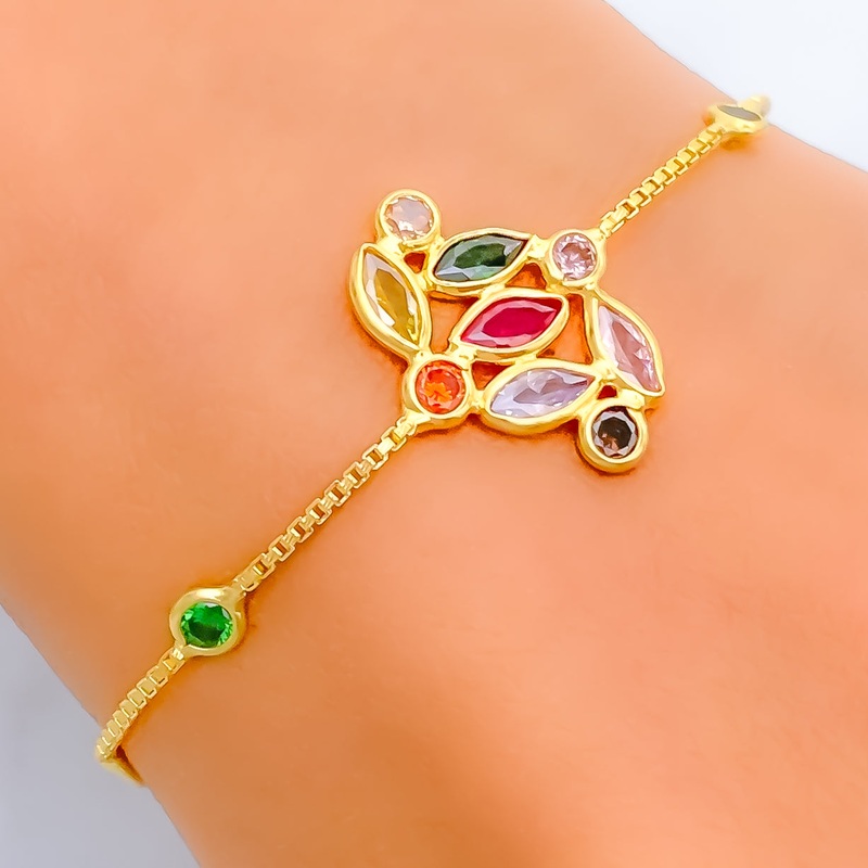 This 22k gold bracelet radiates faceted charm, weighing 4.1 grams. The yellow gold finish beautifully accentuates the brilliance of the cubic zirconia stones, creating an elegant and eye-catching look. Measuring 6.5 inches in length, it offers a secure and