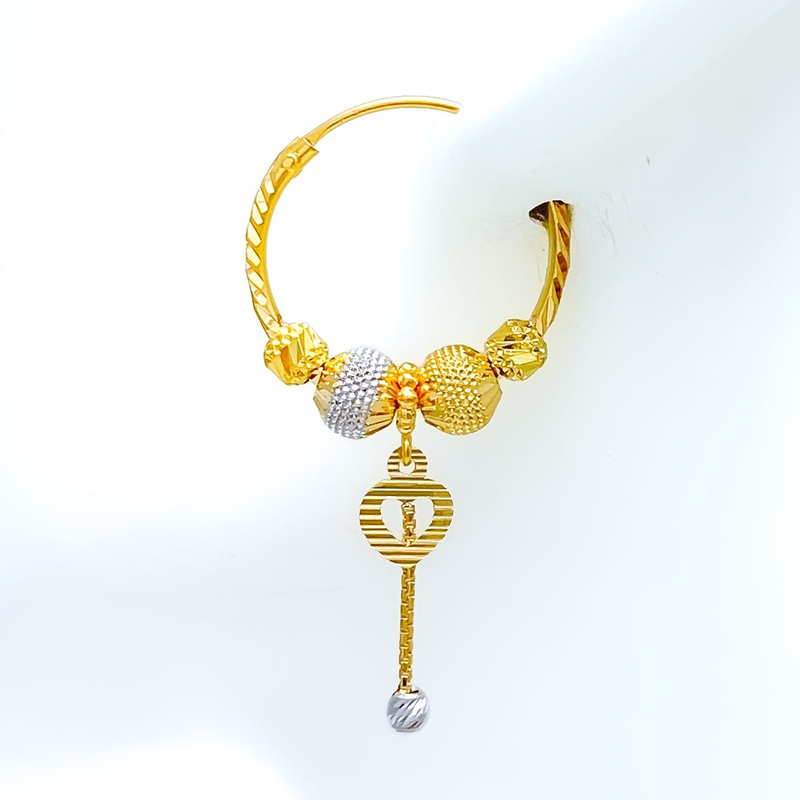 These exquisite 22k gold hoop earrings, weighing 5.7 grams, feature a beautiful combination of yellow and white gold finishes with a faceted design. Each earring measures 0.75 inches in diameter and 1.75 inches in length, offering a perfect blend of elegance and charm. Ideal for those who appreciate sophisticated and unique jewelry, these Bali-style hoop earrings combine the timeless beauty of gold with a striking two-tone motif, making them a perfect choice for any special occasion or stylish everyday wear.