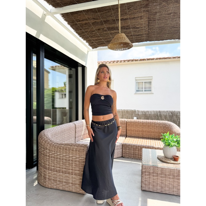 Falda midi de tejido raso y fluida. Se ajusta a la cintura mediante goma elstica.