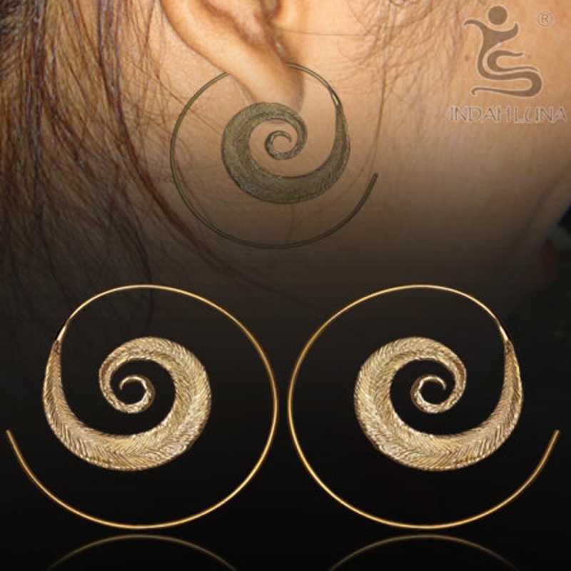 These 18 gauge feather spirals are made of solid yellow brass and measure approximately 44mm tall x 43mm wide.