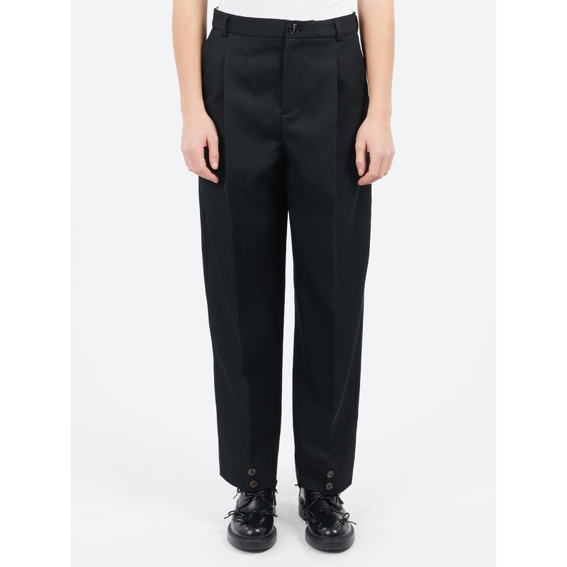 These versatile trousers feature a straight and loose cut, offering both comfort and style. The lower leg is adjustable with two buttons, allowing for a customized fit. Practical slant pockets are positioned at the front, while welt pockets on the back add a touch of classic design. Crafted from soft black cotton, they are perfect for everyday wear, blending casual ease with contemporary flair.