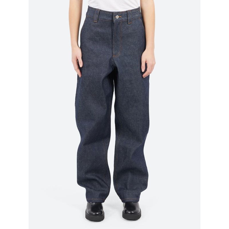 These wide-leg carpenter jeans are made from iconic A.P.C. Japanese denim, offering both style and durability. With a straight cut and loose fit, they provide a relaxed, comfortable silhouette that sits at a mid-rise. The design features multiple pockets for added functionality. A hammer pocket on the left leg adds to the workwear-inspired aesthetic.