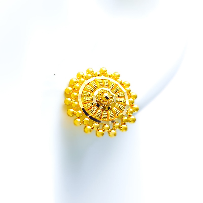 These 22k gold earrings, with a weight of 5.2 grams, epitomize festive lushness. The radiant yellow gold finish highlights their sumptuous design, while the tops style, with a 0.6-inch diameter, offers a refined yet celebratory presence. The secure screw-back post ensures a comfortable fit, making these earrings a splendid choice for those seeking to add a touch of festivity and opulence to their attire.