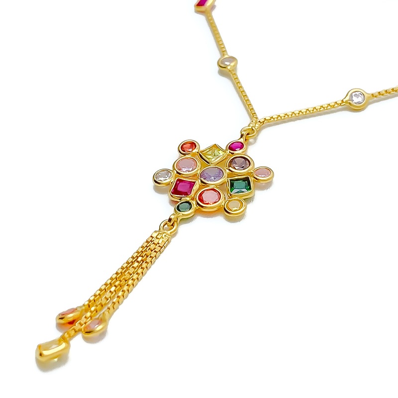 Exude festive elegance with this 22k yellow gold necklace, weighing 10.0 grams. A cubic zirconia mandala pendant takes center stage, radiating brilliance. The necklace spans 18″ with a 2.2″ drop, enhanced by 2″ adjustable links. Secured with a lobster lock, it’s a celebration of style.