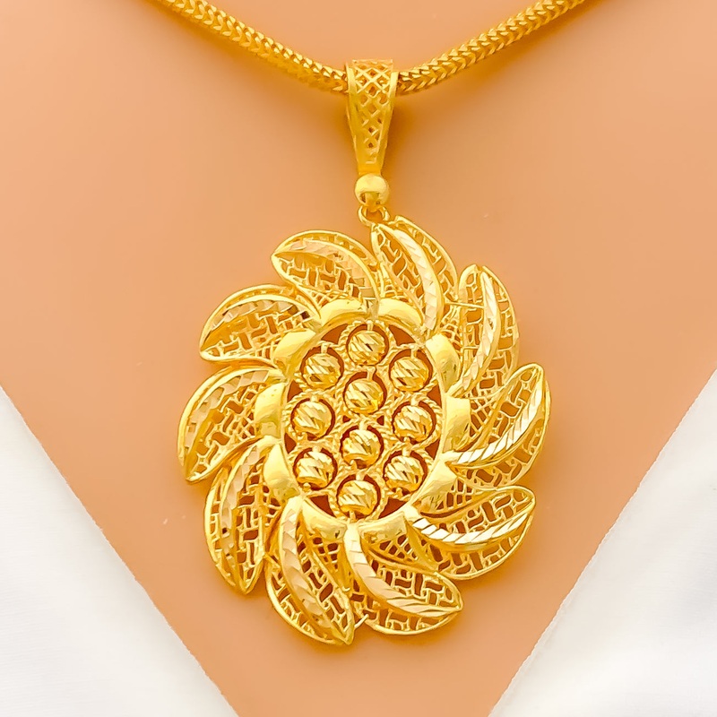 This beautiful 22k gold pendant, weighing 5.9 grams, features a festive ornate design that captures the spirit of celebration. The yellow gold finish enhances its intricate details, making it a striking piece for any occasion. With a length of 1.9 inches, this pendant offers a perfect blend of elegance and festive charm. Ideal for those who appreciate detailed craftsmanship and the timeless allure of high-purity gold, this pendant can be paired with any chain of your choice. Its ornate design and luxurious appearance make it a treasured addition to any jewelry collection, adding a touch of grandeur to any outfit.