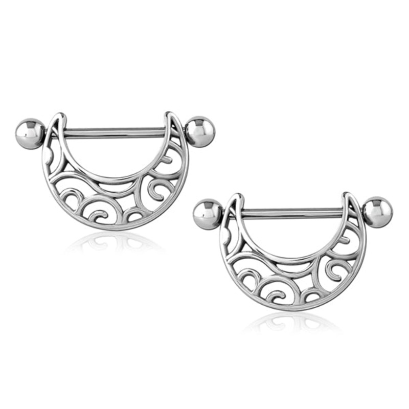 These 14 gauge filigree moon nipple stirrups are made from 316L stainless steel with an interior diameter of 5/8". The 14g 7/8" straight barbells are externally threaded.