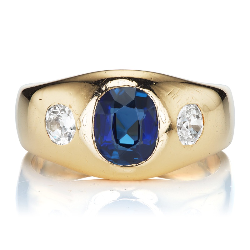 TheFinley ring is an authentic vintage sapphire and diamond ring from the Edwardian Era circa 1900. The ring centers a GIA-certified No Heat Cambodian oval cut sapphire weighing approximately 2.50-carats. An Old Mine Cut diamond is set to either side of the center stone, both combining for approximately 0.56-carats of approximately I-J VS-SI clarity. The stones are bezel set in an 18kt yellow gold setting. The ring is currently size10.25 and can be resized to some sizes.