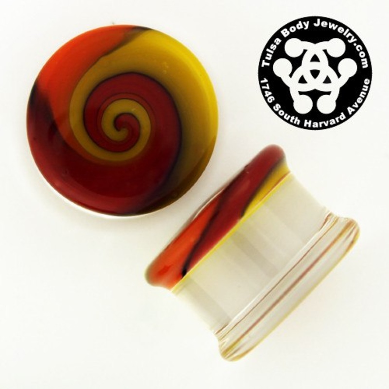 These double flare fire swirl plugs are made from hand blown borosilicate glass by Glasswear Studios. They have a wearable area of approximately 3/8″ between flares. Choose your size below.