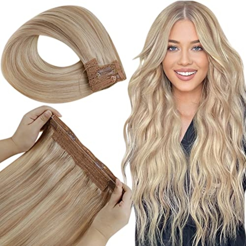 Fish Line Halo Hair Extensions with ClipsRemy Human Hair that is ultra-soft, shiny, silky straightDouble Fixed with Fish Line and Clips--Lace WeftInvisible transparent wire and 4 clips, more Stable. 1 Pcs Hair Extensions - 3 Color Shadings; solid, higlight