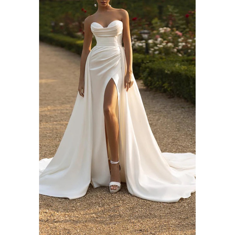 Fish Tail Wedding Dress Sweetheart Satin Pleated Simple Bridal Dress with Detachable hem