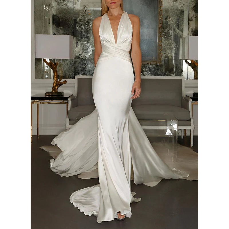 Fishtail V-neck sleeveless trailing silk satin wedding dress