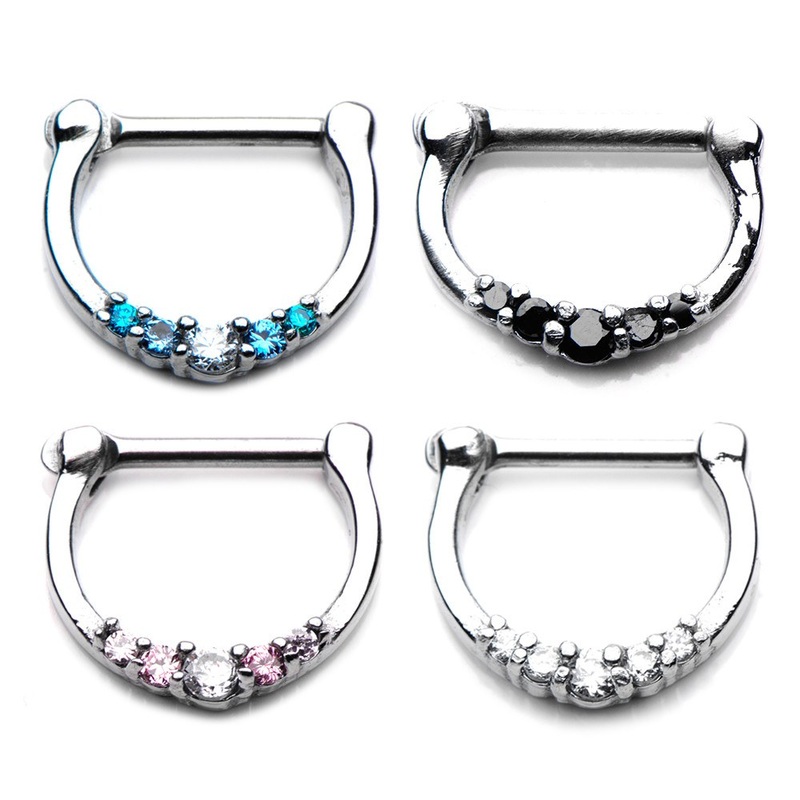 The five gem septum clicker is made from 316L stainless steel. The 5/16" long barbell is hinged on one side and snaps firmly shut on the other. Interior diameter is a measurement inside the clicker from top to bottom. Choose your gem color below.